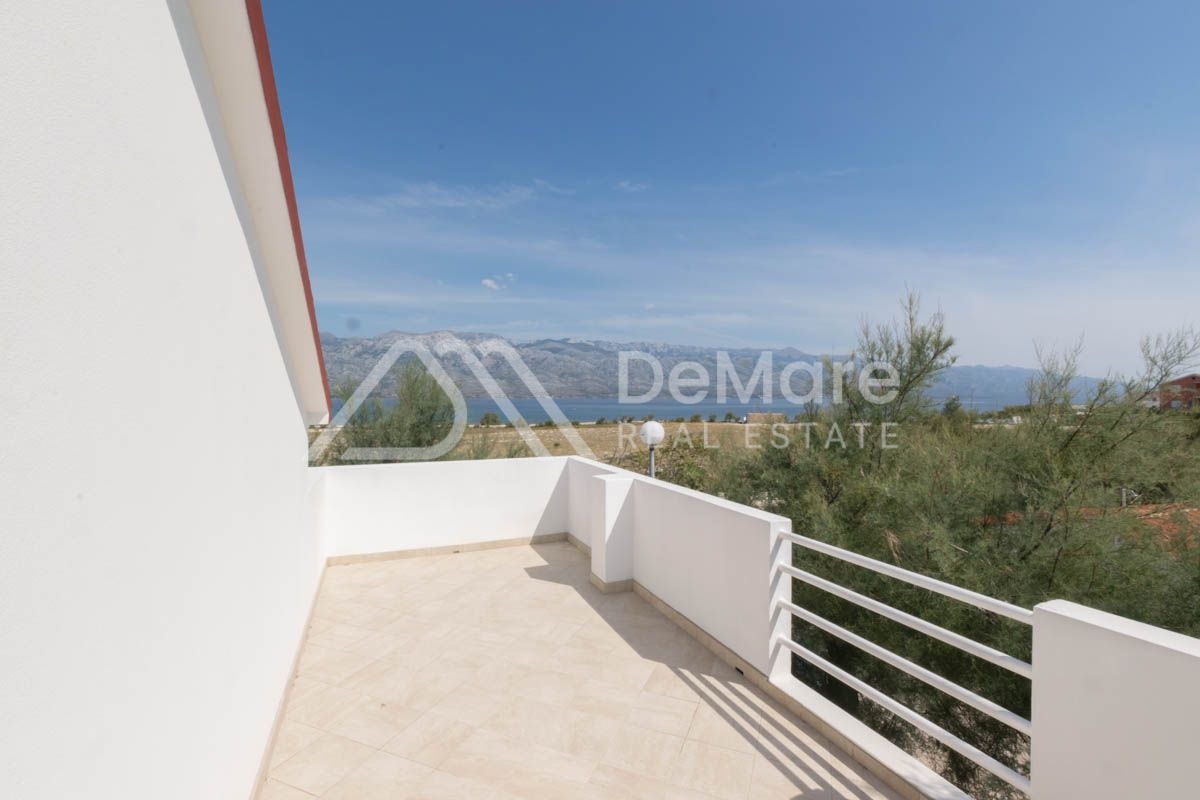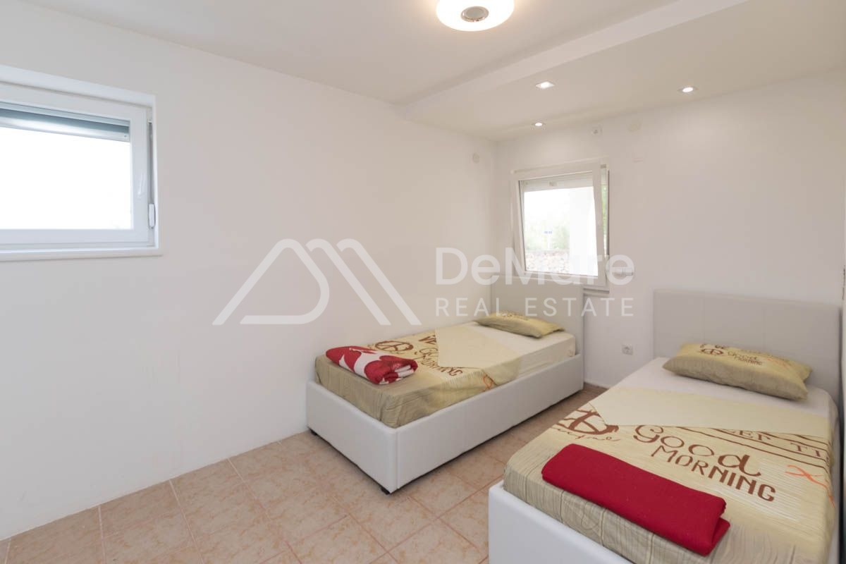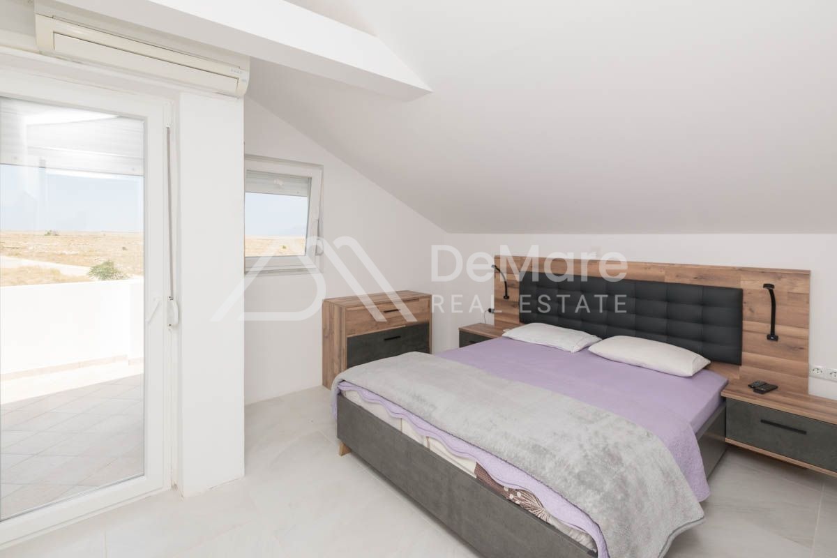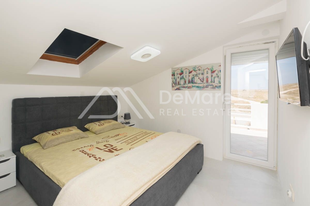 Grundstück von 160 m2, erste Reihe zum Meer in Ražanac. Es besteht aus einem Erdgeschoss und einem hohen Dachgeschoss. Im Erdgeschoss gibt es ein geräumiges Wohnzimmer mit Esszimmer, Küche, Bad, Schlafzimmer mit eigenem Bad. Im hohen Dachgeschoss befinden sich drei Schlafzimmer, zwei Badezimmer und zwei große Terrassen. Auf der gesamten Etage ist eine Fußbodenheizung installiert.