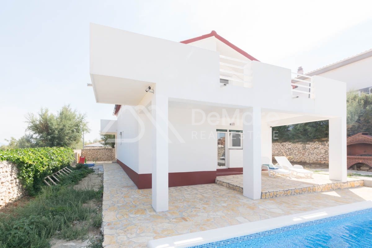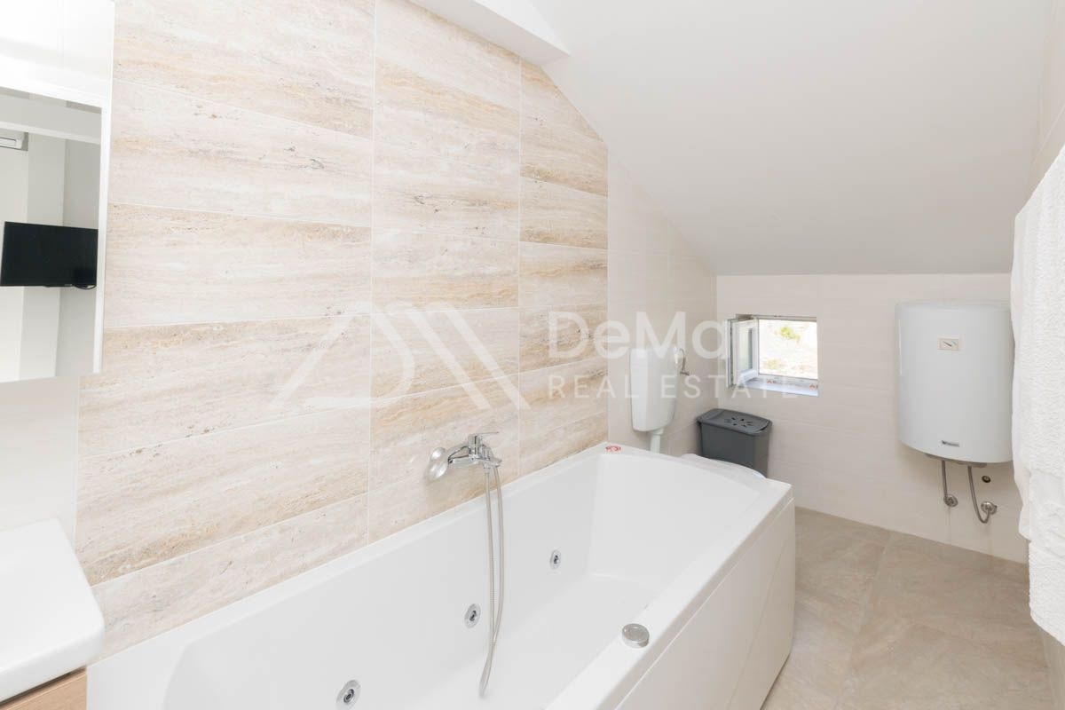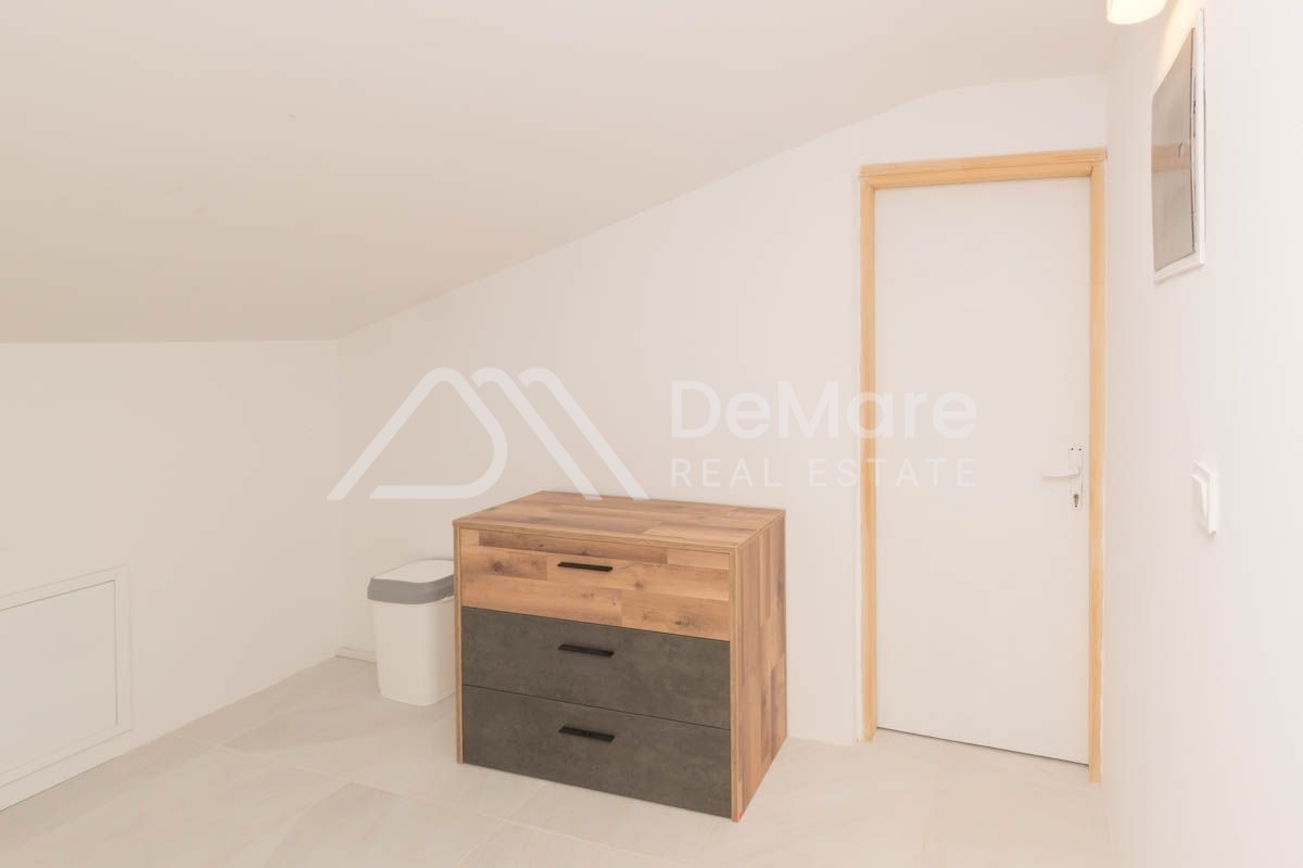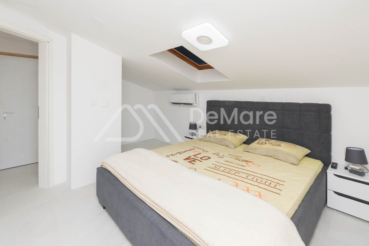 Grundstück von 160 m2, erste Reihe zum Meer in Ražanac. Es besteht aus einem Erdgeschoss und einem hohen Dachgeschoss. Im Erdgeschoss gibt es ein geräumiges Wohnzimmer mit Esszimmer, Küche, Bad, Schlafzimmer mit eigenem Bad. Im hohen Dachgeschoss befinden sich drei Schlafzimmer, zwei Badezimmer und zwei große Terrassen. Auf der gesamten Etage ist eine Fußbodenheizung installiert.