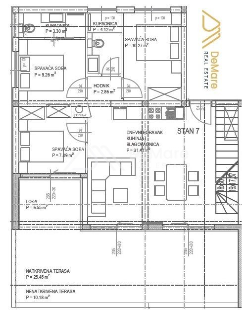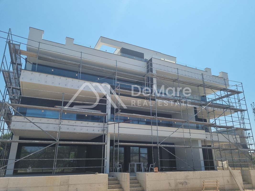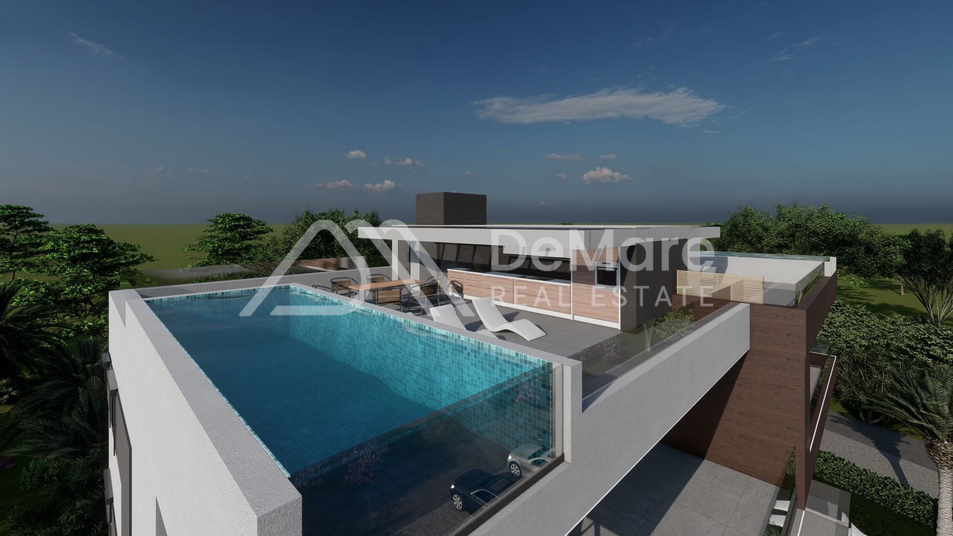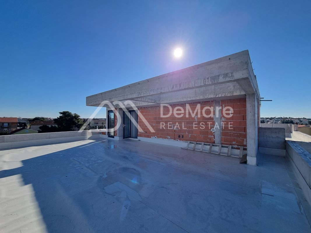 Dies ist ein PENTHOUSE im zweiten Stock. Die Raumaufteilung besteht aus einem Flur, 2 Schlafzimmern, einem Schlafzimmer mit Bad, einem Badezimmer, einer Küche mit Esszimmer und Wohnzimmer sowie einer teilweise überdachten Terrasse. Von der Wohnung aus gelangt man direkt auf die Dachterrasse, die zu dieser Wohnung gehört. Die Fläche der Dachterrasse beträgt 102,32 m2. Auf der Terrasse befindet sich ein 15,30 m2 großer Swimmingpool. Die Nettonutzfläche der beschriebenen Räume mit Terrassen beträgt 130,05 m2. Darüber hinaus verfügt die Wohnung über zwei Parkplätze.