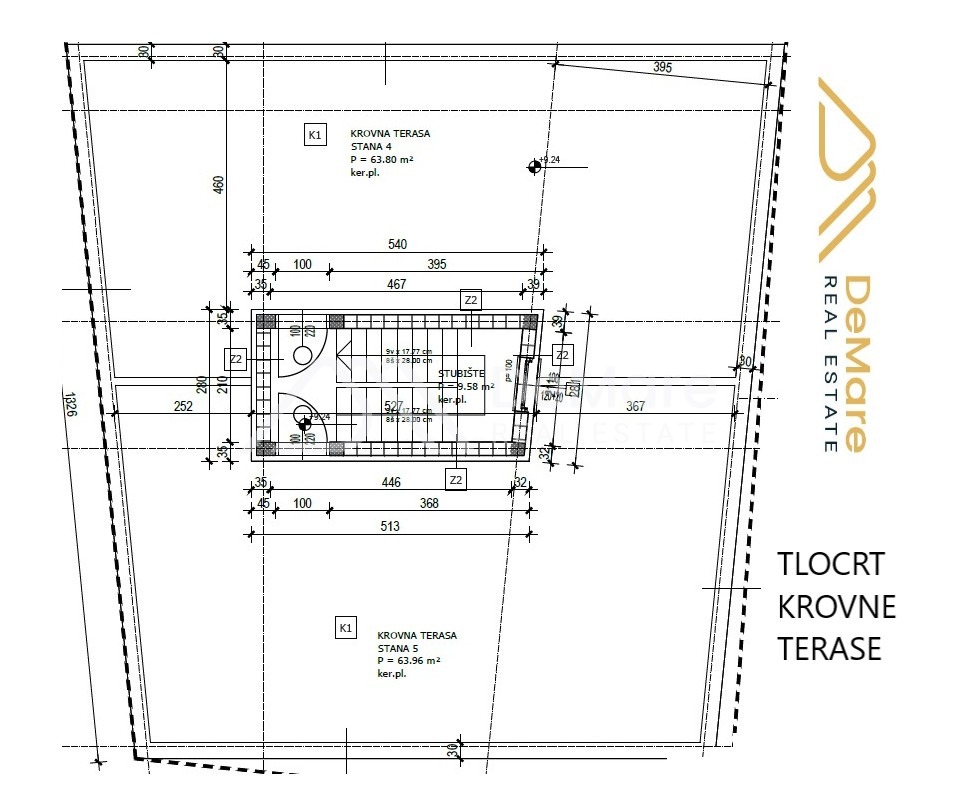 Das Dach ist in zwei Dachterrassen unterteilt, und jede Wohnung im zweiten Obergeschoss verfügt über eine separate Dachterrasse.