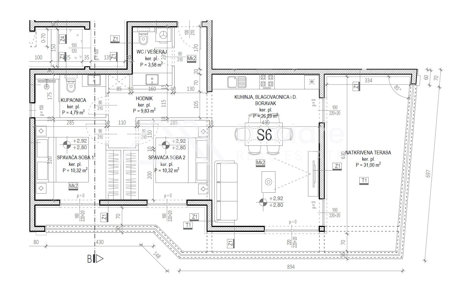 - offenem Wohn-/Essbereich mit Küche (26,23 m²),