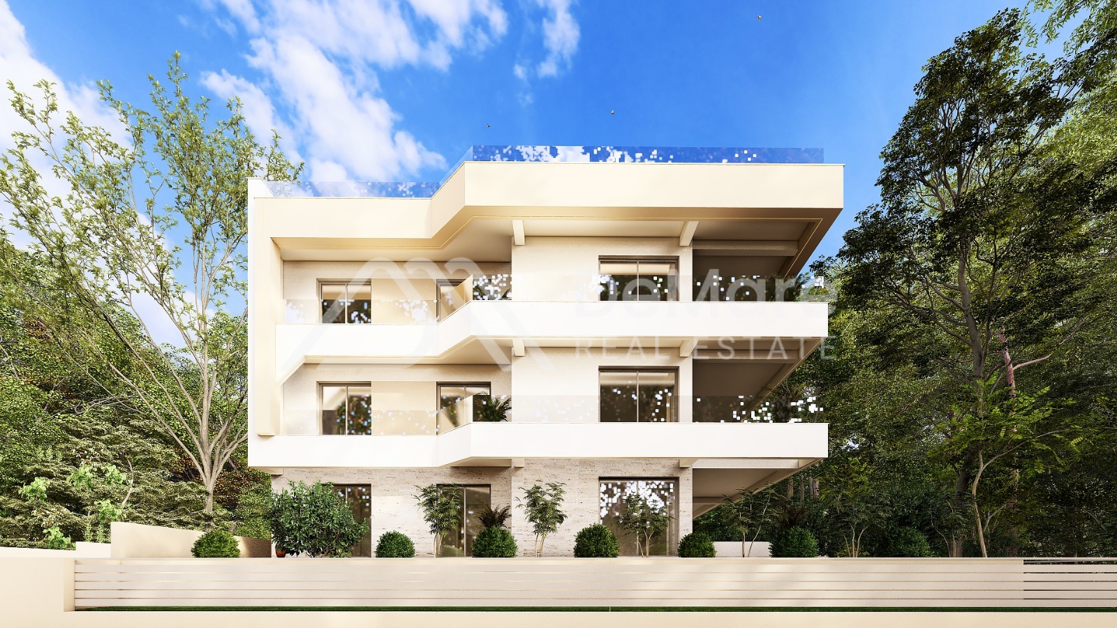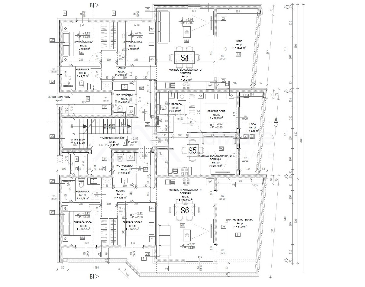 Das Dach ist in drei Dachterrassen unterteilt, und jede Wohnung im zweiten Obergeschoss hat eine eigene Dachterrasse.