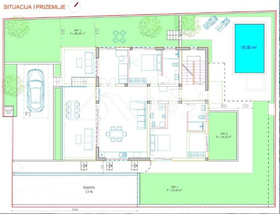 Die Lage der Anlage ist aufgrund der Nähe zum Meer und Strand, ca. 100 m, die Entfernung zum Stadtzentrum von Zadar beträgt ca. 3,5 km und vom Flughafen Zemunik sind es ca. 13 km.