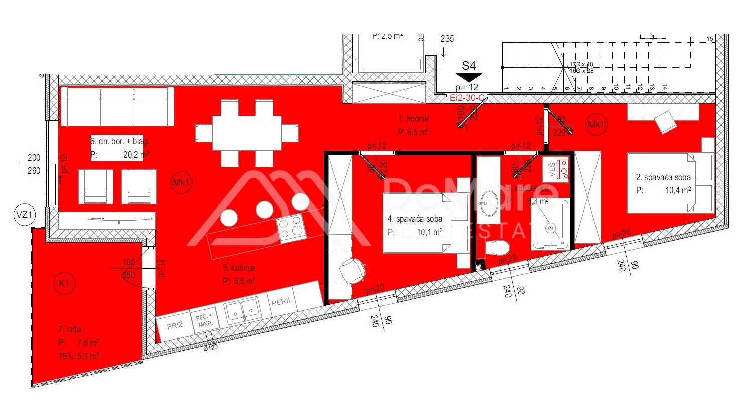 Das Dach des Gebäudes ab dem zweiten Obergeschoss ist in zwei Dachterrassen unterteilt, und jede Wohnung im zweiten Obergeschoss verfügt über eine eigene Dachterrasse.
