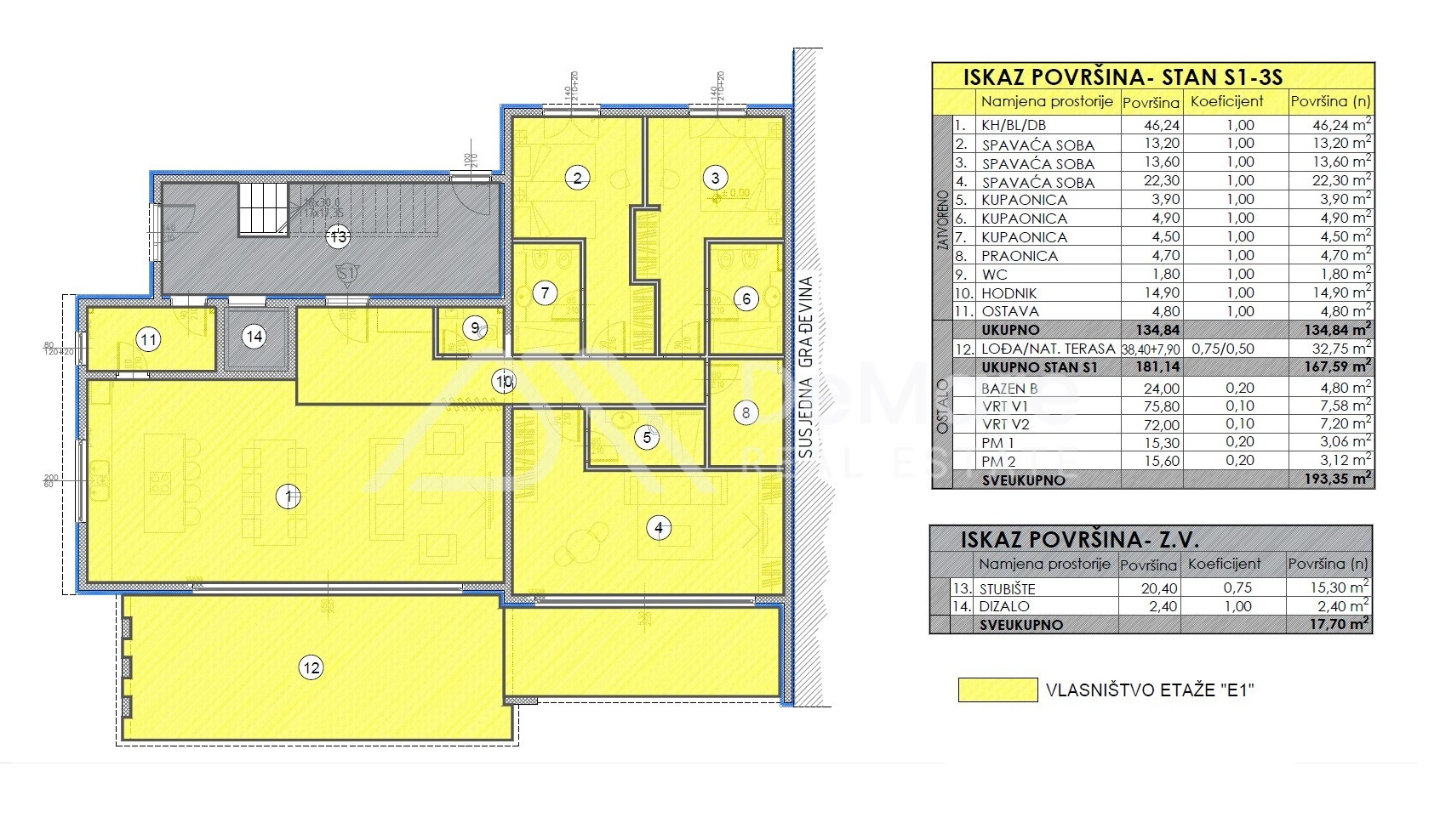 The internal living area is 134.84 m2, and the total net calculated value of the usable area of the apartment with all its belongings is 193.35 m2.