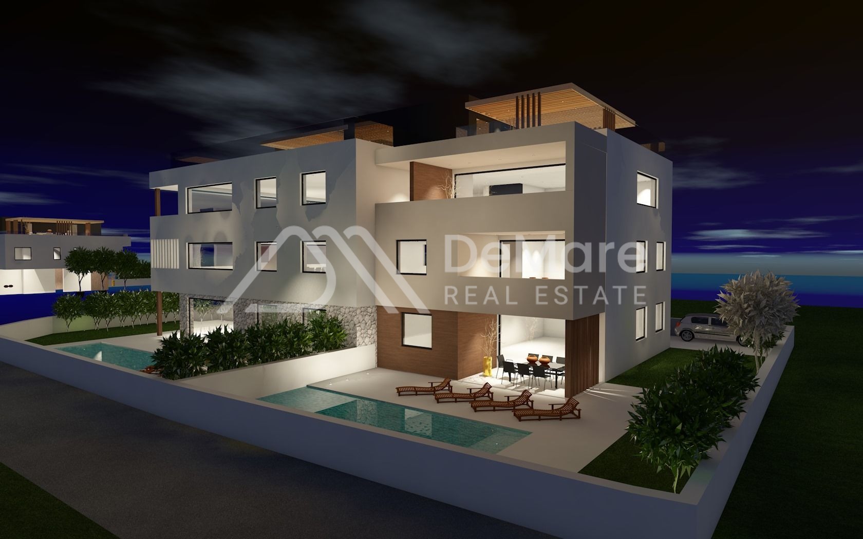 This is a project of an apartment building consisting of a total of 8 apartments. The building has 3 floors; ground floor, first and second floors and a roof terrace, where two apartments on the ground floor have gardens and swimming pools, and the apartments on the second floor have their own roof terraces with panoramic views of the sea and islands.
