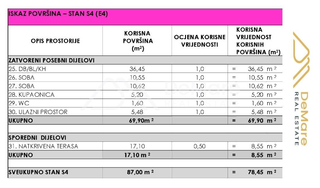The interior living space of the apartment is 69.90 m2, while the total calculated useful value of the apartment's area is 80.75 m2.