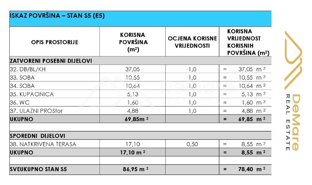 The interior living space of the apartment is 69.85 m2, while the total calculated useful value of the apartment's area is 80.70 m2.