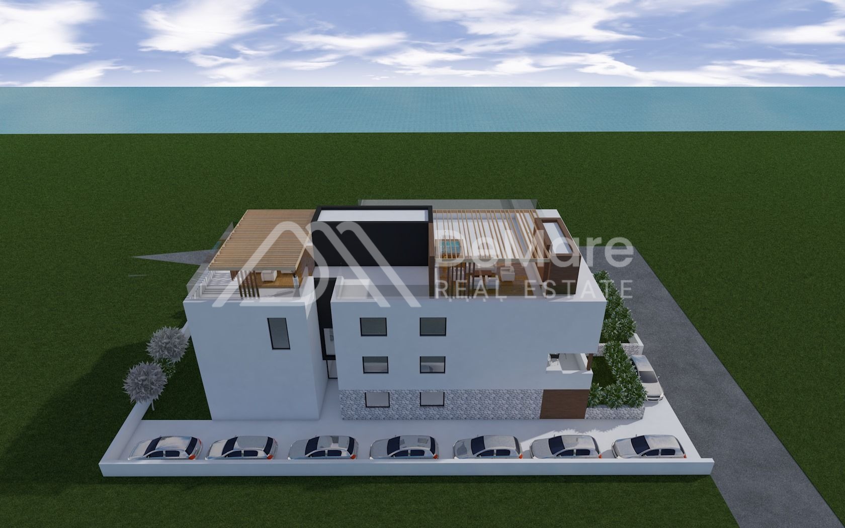 This is a project of an apartment building consisting of a total of 8 apartments. The building has 3 floors; ground floor, first and second floors and a roof terrace, where two apartments on the ground floor have gardens and swimming pools, and the apartments on the second floor have their own roof terraces with panoramic views of the sea and islands.
