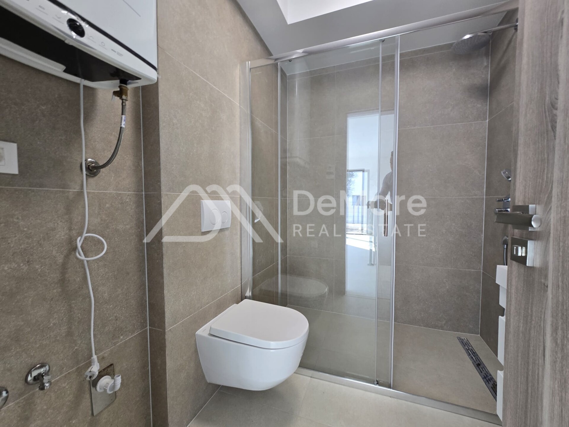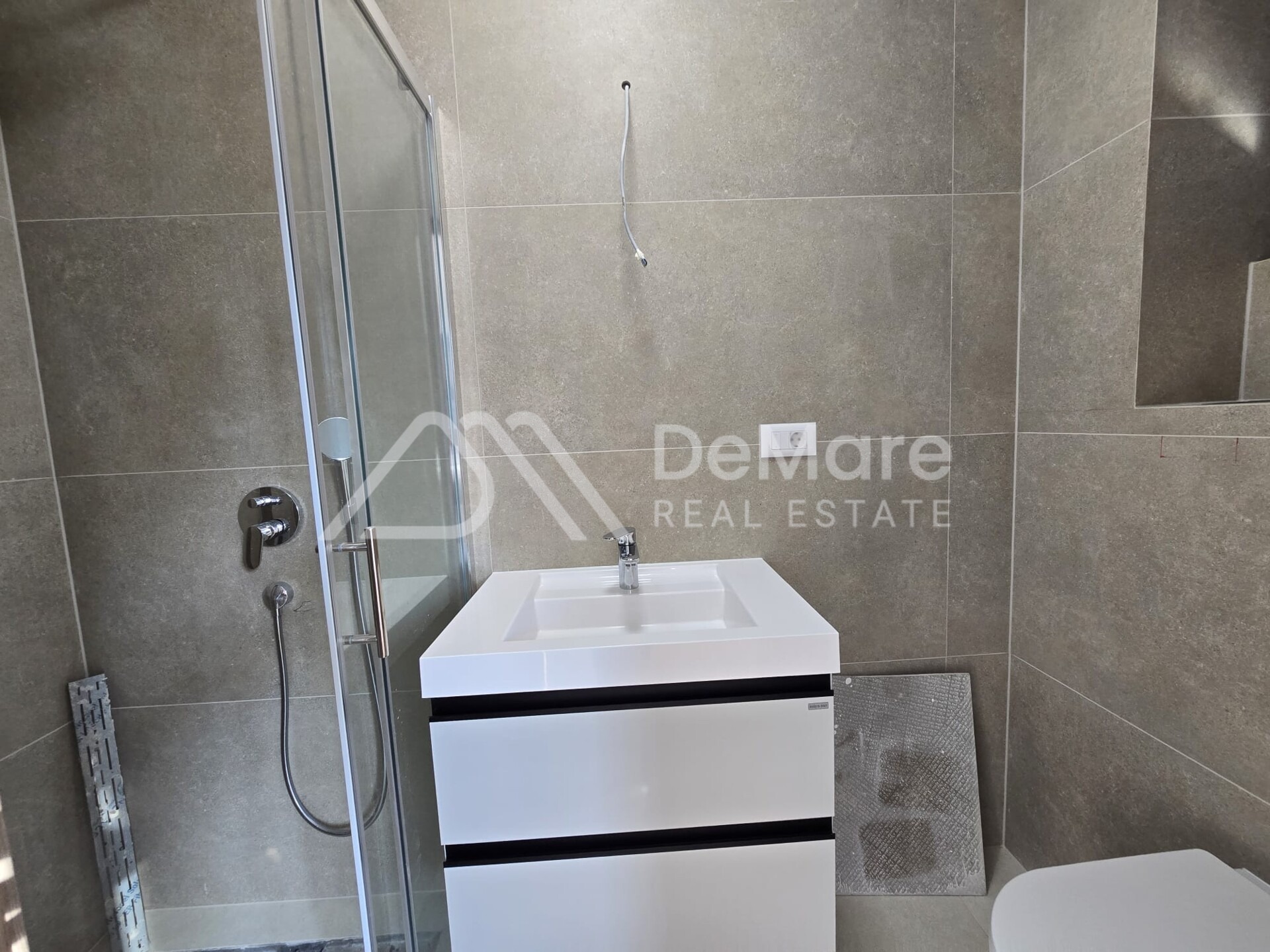 A beautiful luxurious, new, modern apartment in an attractive location, near the sea and the beach; it occupies half of the ground floor, and also has a part of the yard. The living room is separated from the garden (73.25 m2) by a sliding glass wall only, where various outdoor facilities can be arranged.