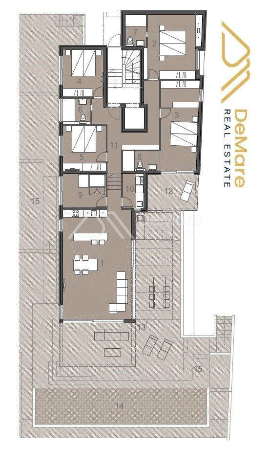Also on the ground floor is a special relaxation and wellness area with a built-in sauna, which has access to a separate outdoor terrace with a sundeck.