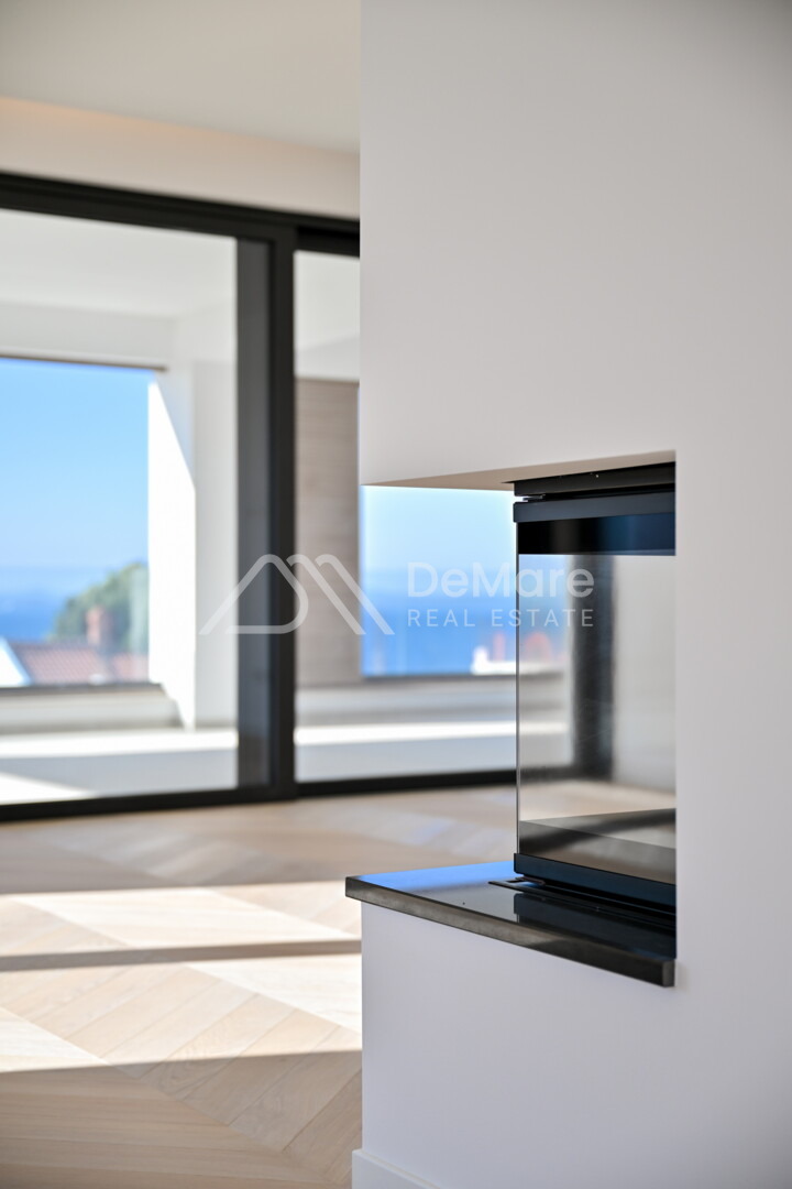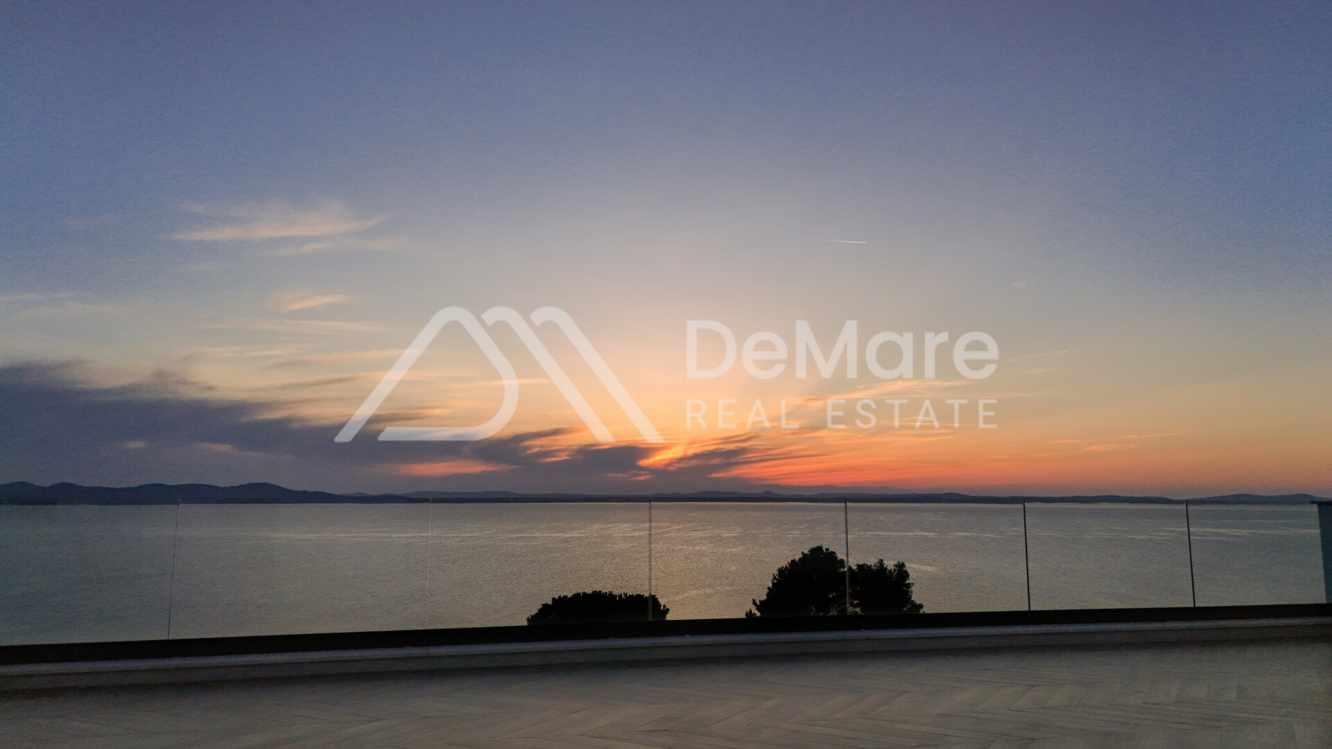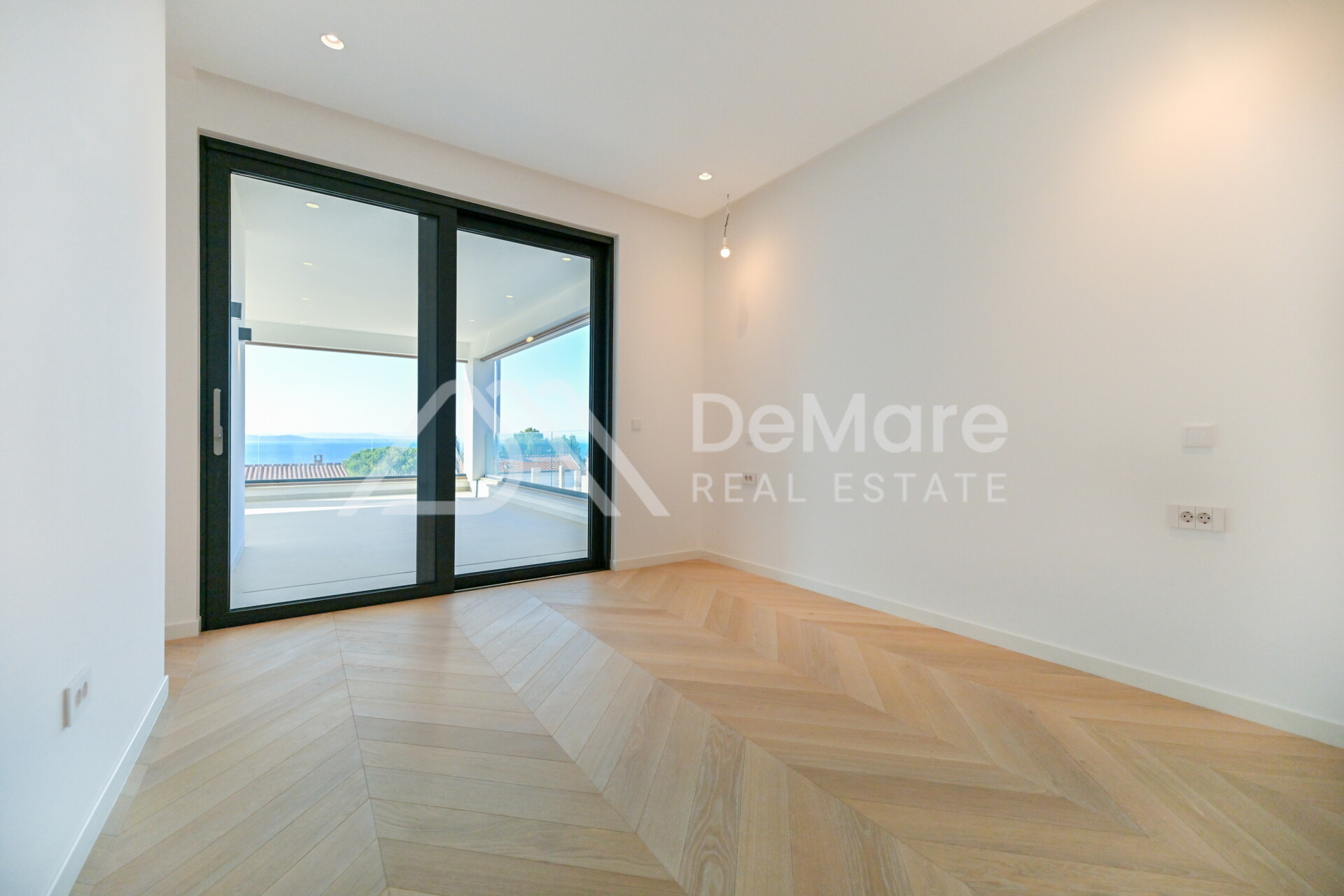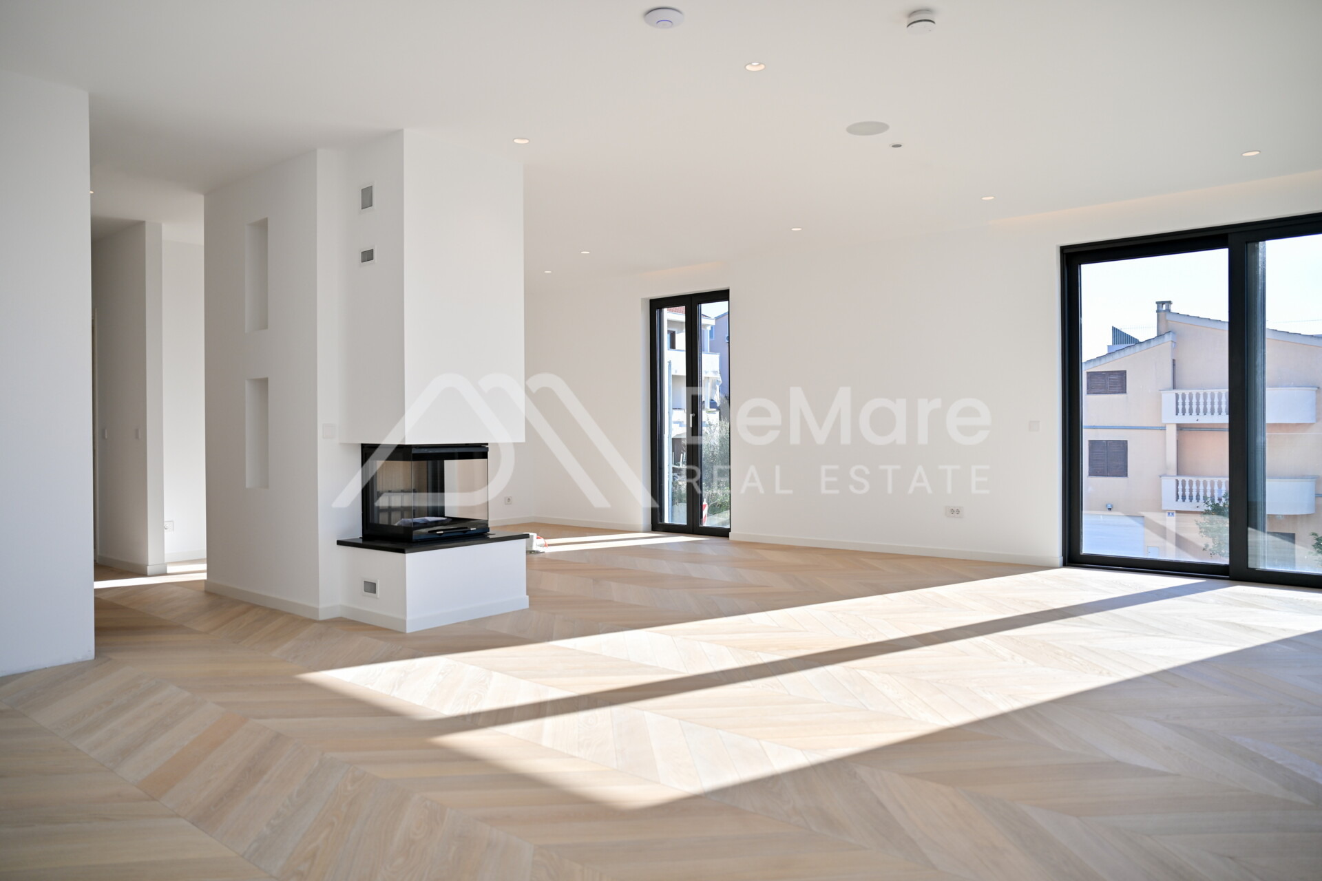 This comfortable, luxurious apartment covers the entire first floor of the building, and large glass walls divide the dining room and living room from a covered terrace overlooking the sea, where a summer kitchen and outdoor dining and living furniture can be placed.
