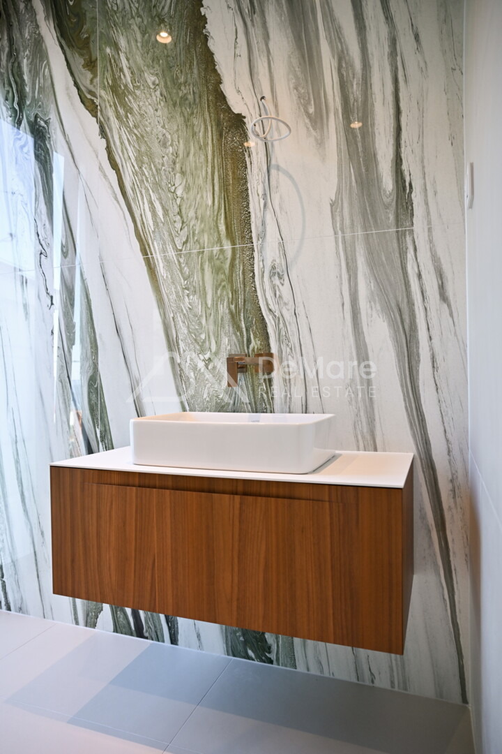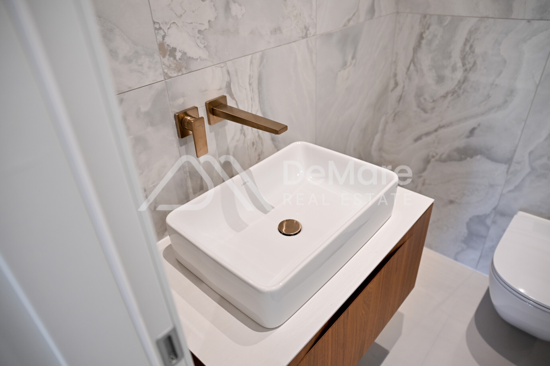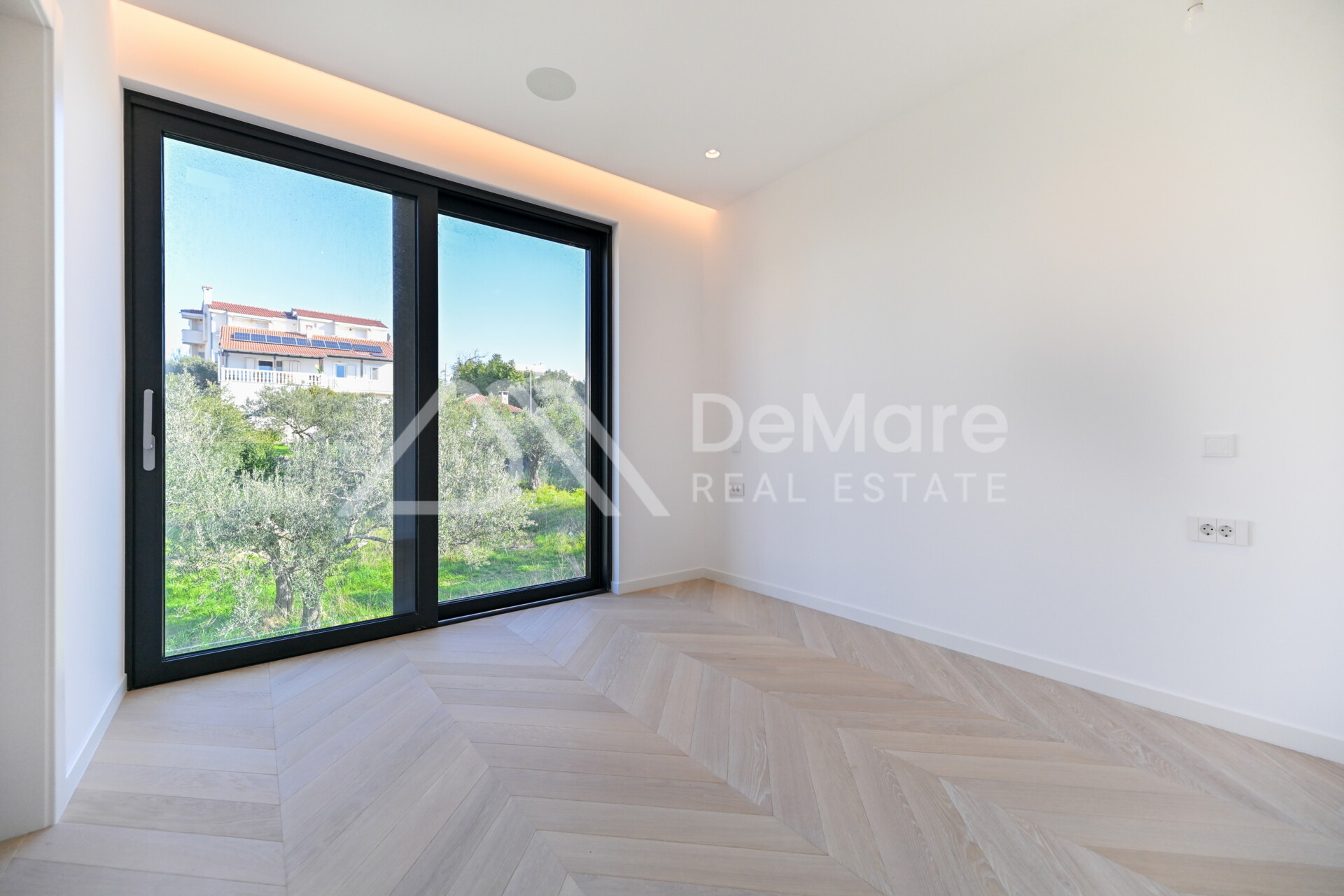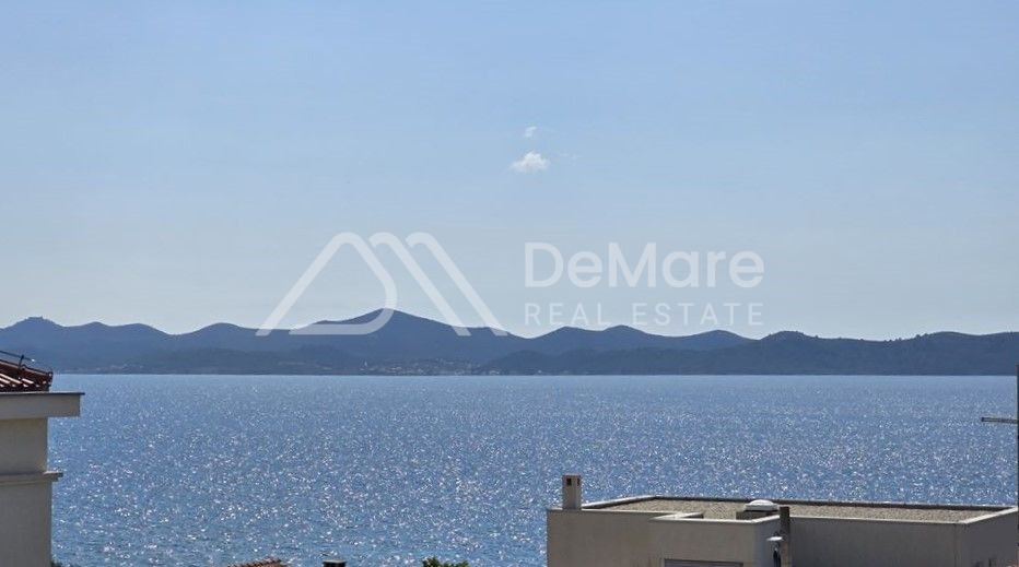 This comfortable, luxurious apartment covers the entire first floor of the building, and large glass walls divide the dining room and living room from a covered terrace overlooking the sea, where a summer kitchen and outdoor dining and living furniture can be placed.