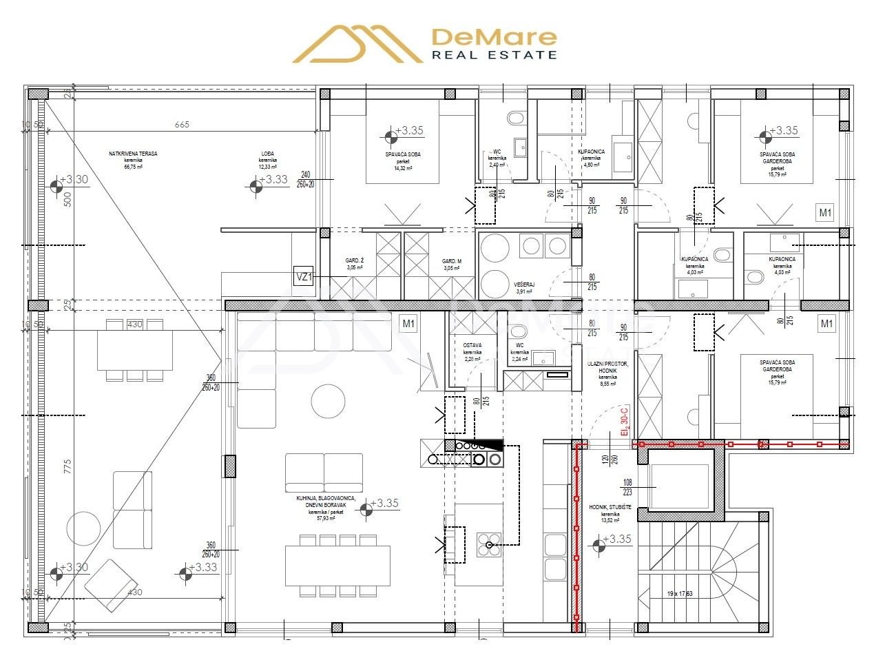 - Three bathrooms / 4.03 m2 + 4.80 m2 + 4.03 m2