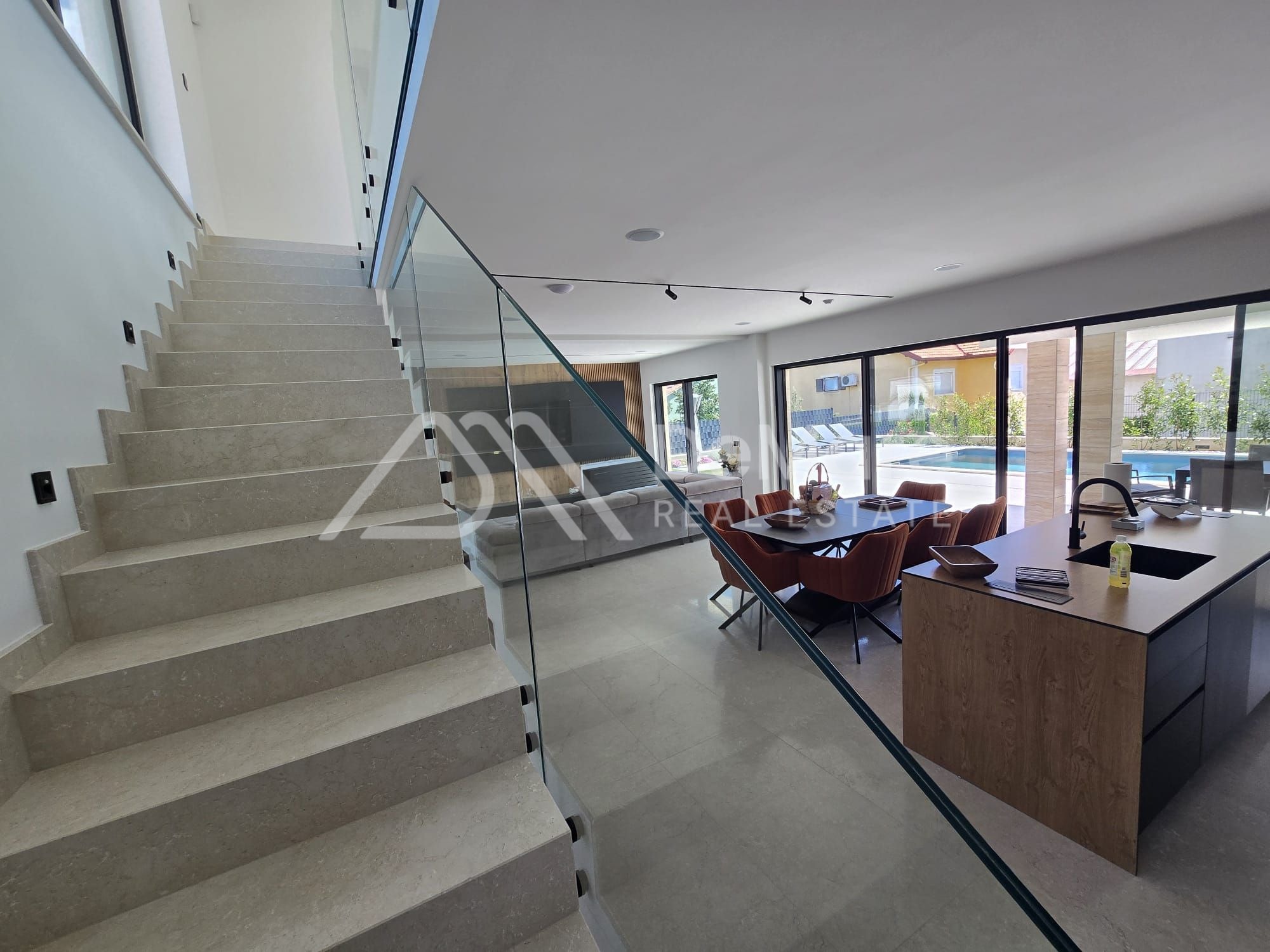 The internal staircase leads to the first floor where there are three comfortable master bedrooms with private bathrooms and walk-in closets and access to a loggia and terrace with sea view.