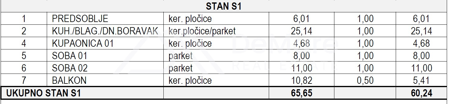 Unutarnja stambena površina stana iznosi 54,83 m2, a ukupna obračunska korisna vrijednost površine stana s pripadcima iznosi 69,84 m2.