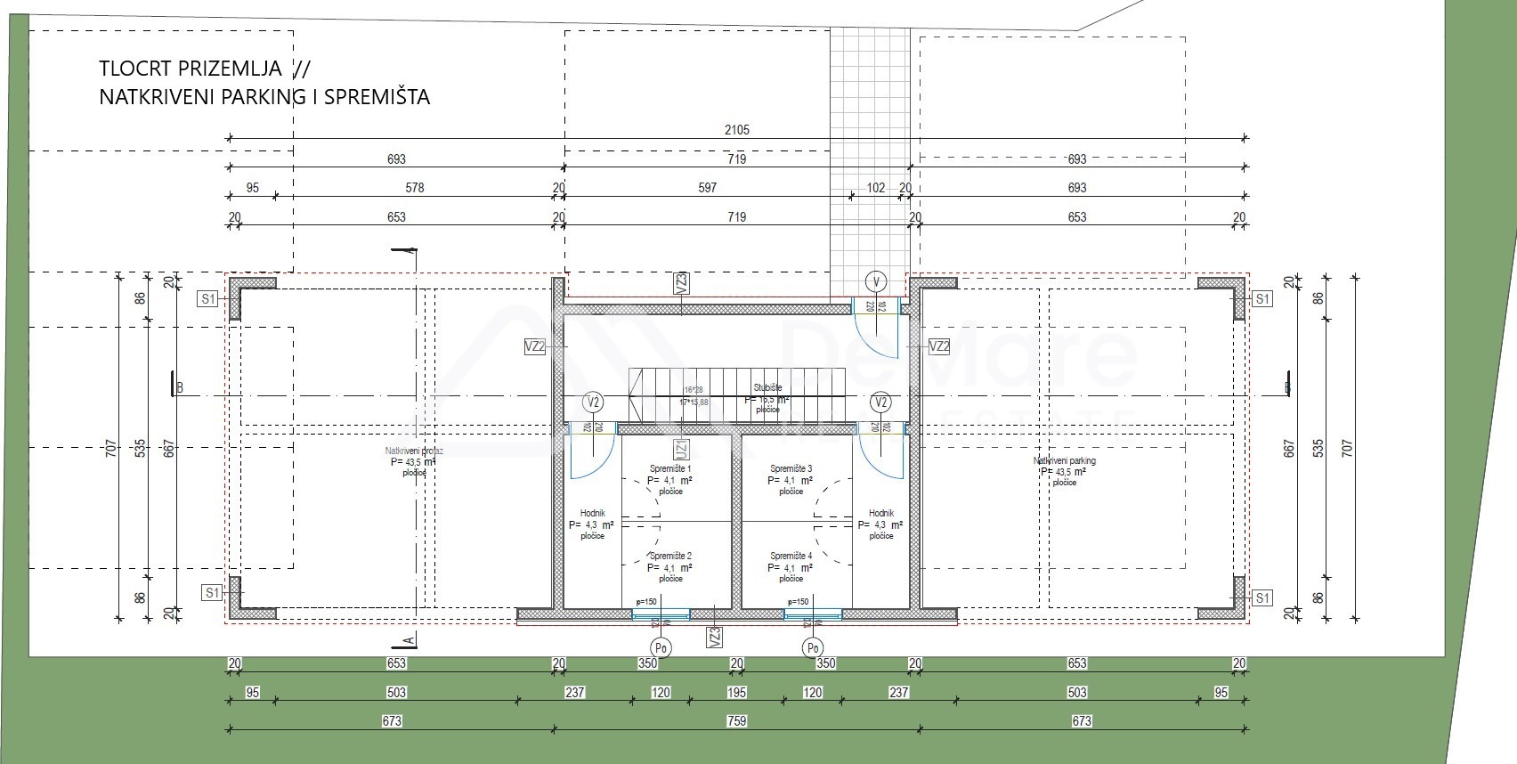 U prizemlju se nalaze spremišta i natkriveni parkig, a vanjska nenatkrivena parkirna mjesta smještena su na uređenoj okućnici zgrade. Svakom stanu pripadaju 2 parkirna mjesta.