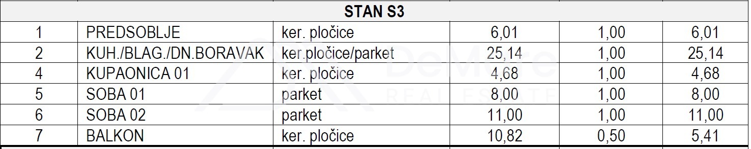 Unutarnja stambena površina stana iznosi 54,83 m2, a ukupna obračunska korisna vrijednost površine stana s pripadcima iznosi 69,84 m2.