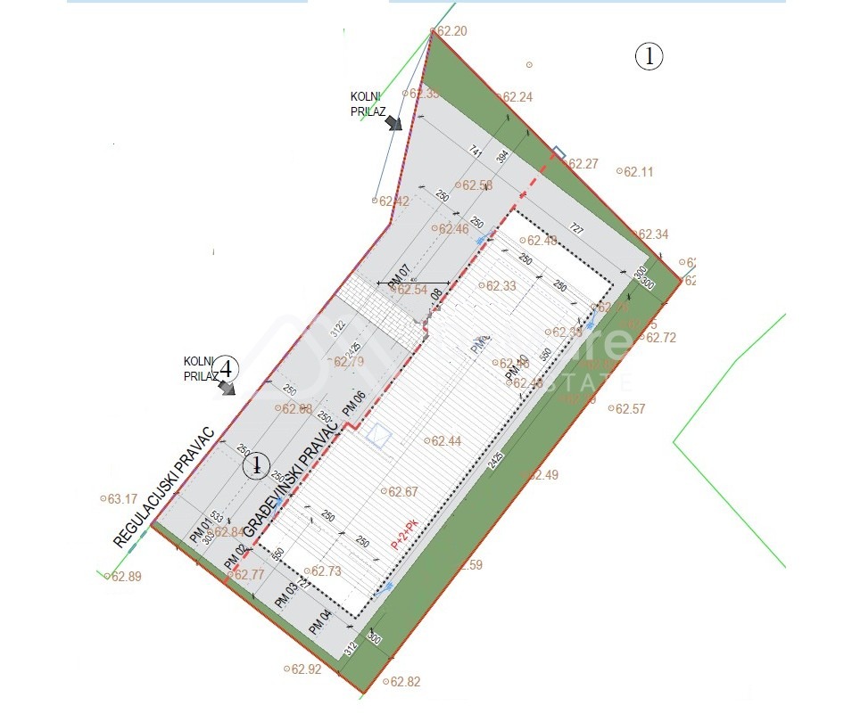 U prizemlju se nalaze spremišta i natkriveni parkig, a vanjska nenatkrivena parkirna mjesta smještena su na uređenoj okućnici zgrade. Svakom stanu pripadaju 2 parkirna mjesta.