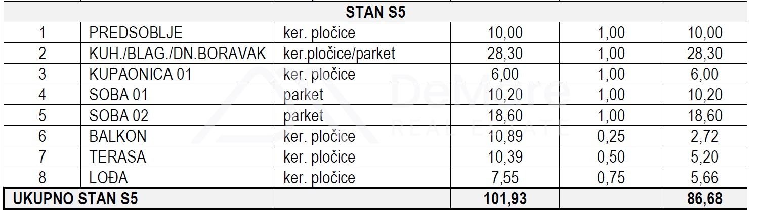 Unutarnja stambena površina stana iznosi 73,10 m2, a ukupna obračunska korisna vrijednost površine stana s pripadcima iznosi 100,43 m2.