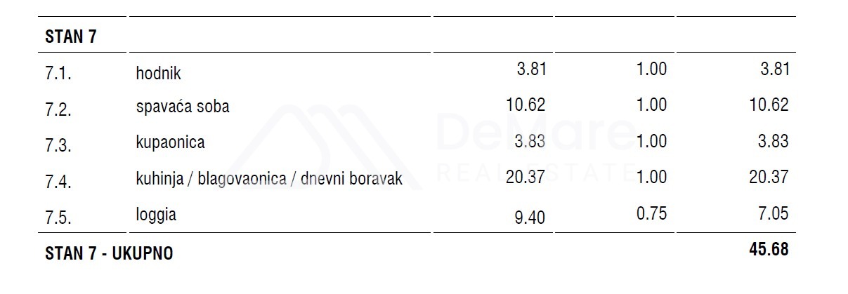 Unutarnja površina stana je 38,63 m2, a ukupna korisna obračunska vrijednost površine stana s pripadcima iznosi 55,09 m2.