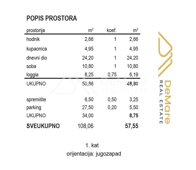 Unutarnja stambena površina iznosi 42,61 m2, dok je ukupna obračunska korisna vrijednost površine stana s pripadcima 57,55 m2.
