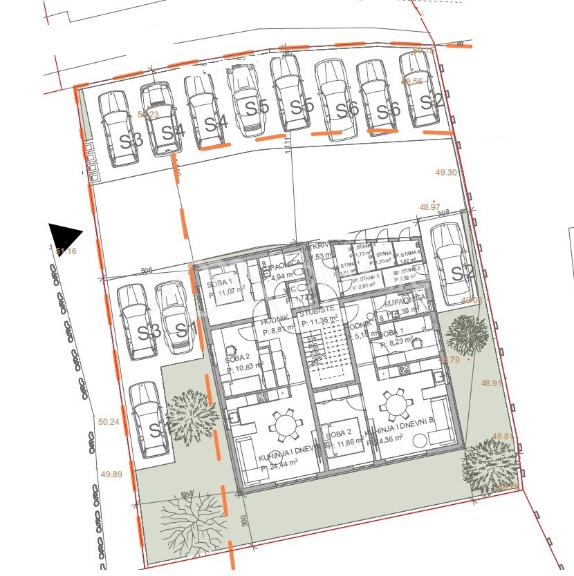 - Svakom stanu pripadaju dva vanjska parkirna mjesta i jedno spremište u prizemlju zgrade