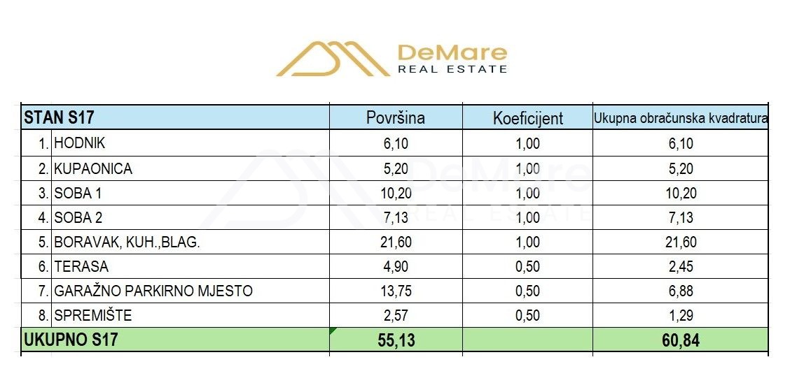 Stanu pripada i jedno garažno parkirno mjesto / 13,75 m2 i spremište / 2,57 m2 u podrumu zgrade. Ukupna obračunska vrijednost korisne površine stana iznosi 60,84 m2.