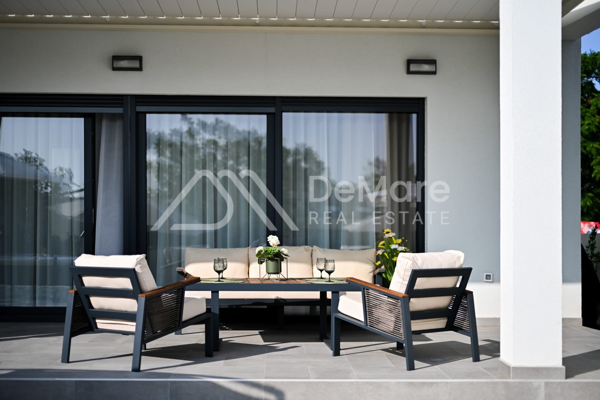 Osjećaj povezanosti interijera i eksterijera daju i staklene stijene koje dijele blagovaonicu i dnevni boravak od terase koja je natkrivena automatiziranom bioklimatskom pergolom, i na kojoj je postavljen outdoor namještaj za ugodan boravak na otvorenom.