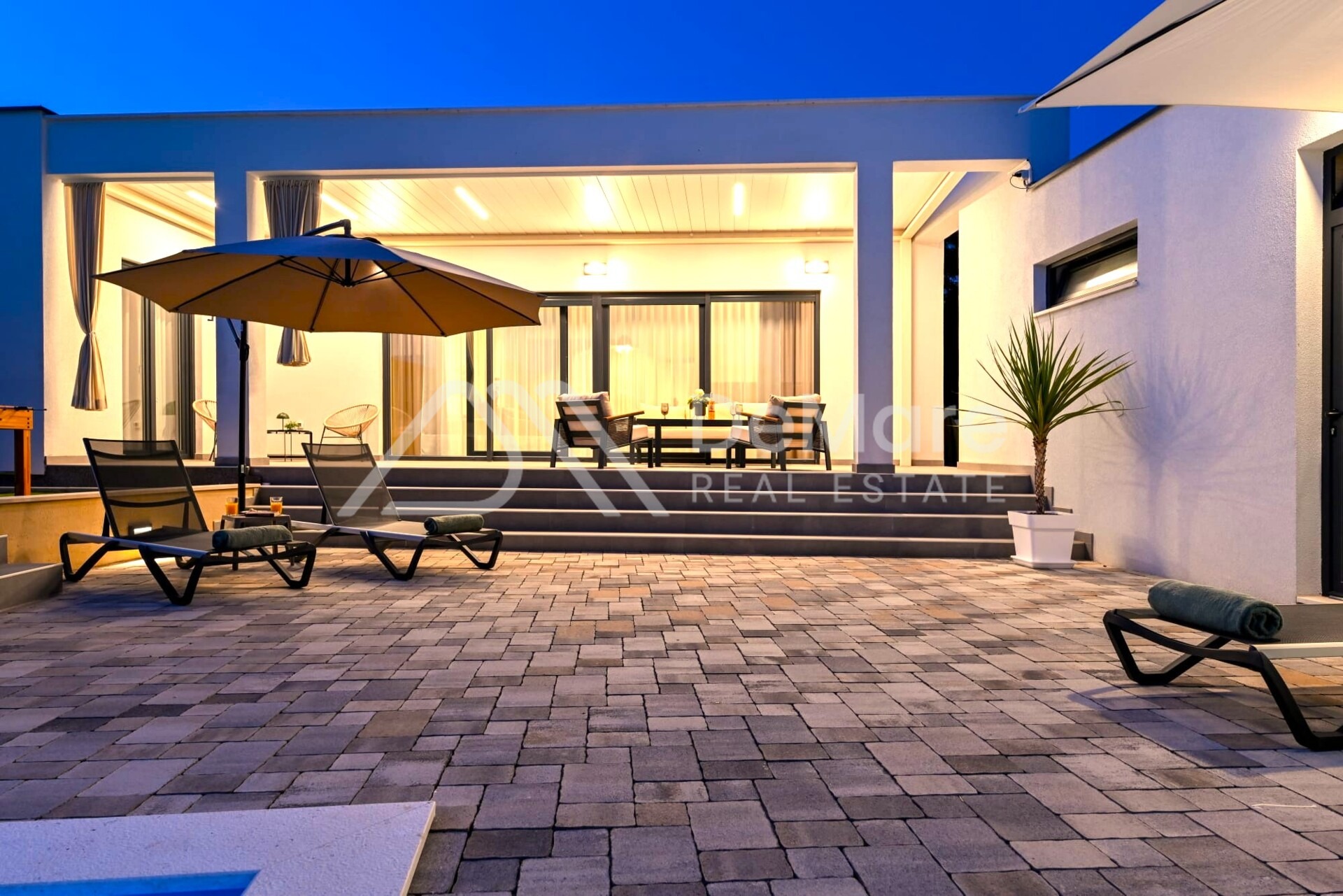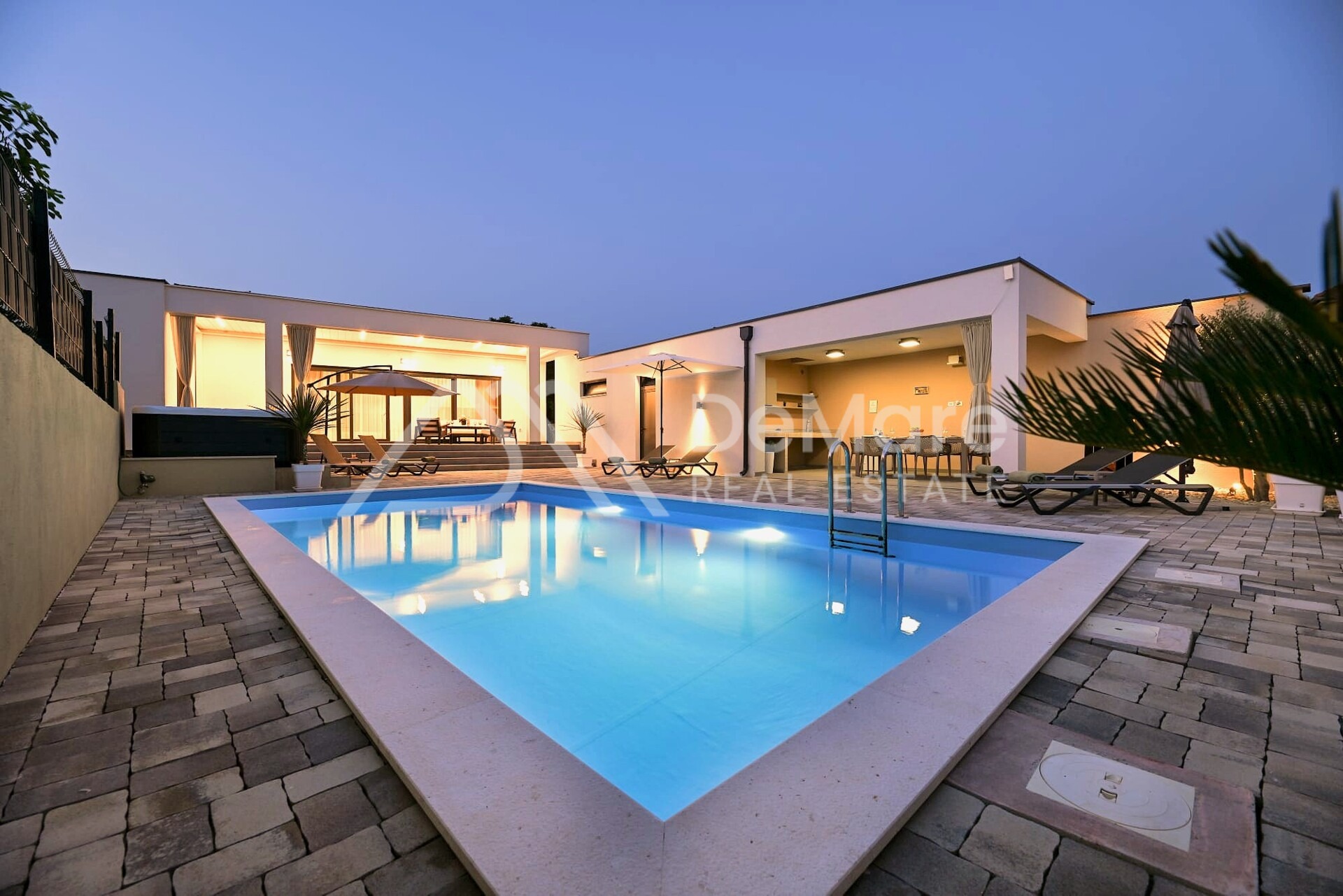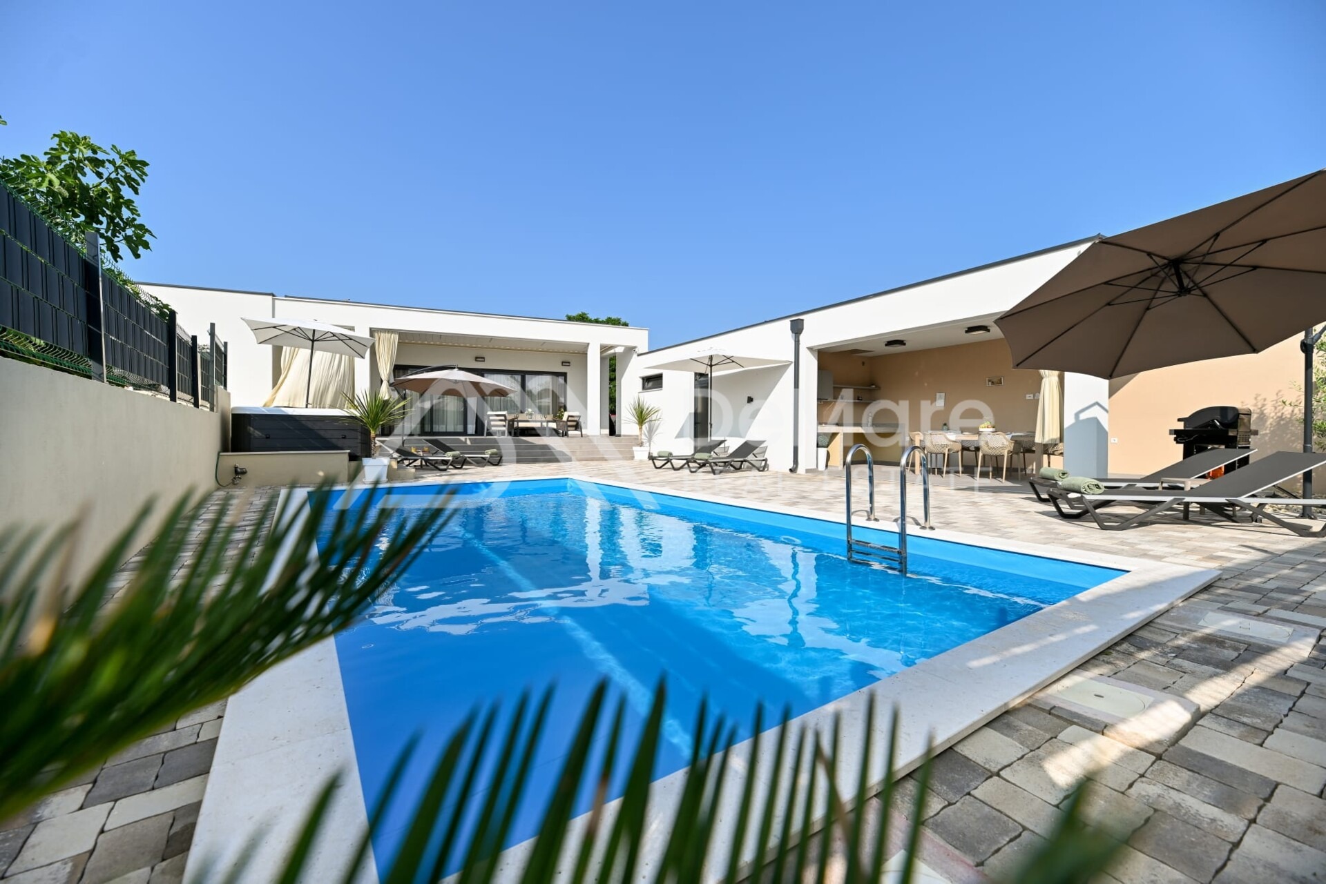 Sve terase su popločane i povezane s grijanim bazenom i sunčalištem na kojem su smještene ležaljke, a cijela parcela je okružena zidanom ogradom, što omogućuje potpunu privatnost i zaštitu od pogleda.